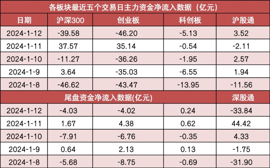 沪深300今日主力资金净流出39.58亿元,创业板净流出46.2亿元。沪股通净流入3.52亿元,深股通净流出33.84亿元。